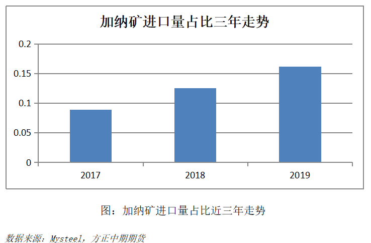进口结构中,非主流矿的占比近些年呈现逐年上升趋势,从2015年的6.86%上升至2018年的18.7%,涨幅接近三倍。今年该趋势更加明显,前三季度非主流矿进口量共计597.7万吨,占总进口量的比例进一步上升至24.4%,为近5年最高。在非主流矿中,今年以加纳矿的增量最为明显,今年前三季度共进口加纳矿396.8万吨,已经超过去年全年进口量,在进口总量中的占比也从去年的12.56%上升至今年前三季度的16.22%。其中5月单月的进口量超过80万吨,创出近几年单月最高值,一举超过传统主流澳大利亚矿成为该月仅次于南非矿的第二大进口矿种。但进入8月后,随着主流矿报价的下调,性价比再次凸显,对澳矿的进口量逐步回升,对加纳矿形成了一定的挤出效应。